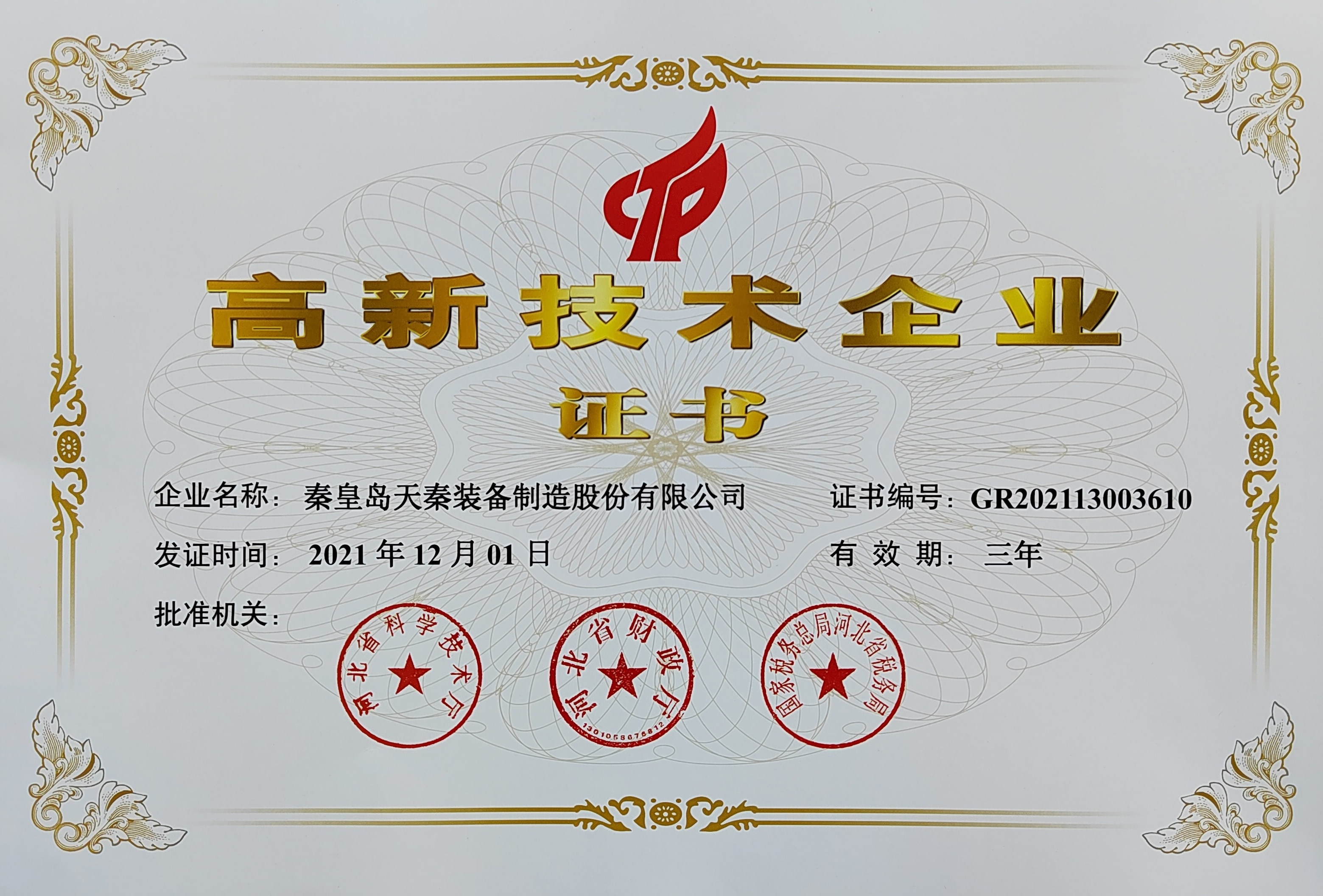 - 秦皇島天秦裝備制造股份有限公司創(chuàng)立于1996年,總部位于河北省秦皇島市經(jīng)濟技術(shù)開發(fā)區(qū),秦皇島廠區(qū)占地4萬平方米,擁有3萬平方米的標準廠房、辦公樓和工程技術(shù)研發(fā)中心;分部天津廠區(qū)位于天津市靜海經(jīng)濟開發(fā)區(qū),占地2萬平方米,擁有1.6萬平方米標準廠房。 公司通過了GB/T 19001質(zhì)量管理體系及GB/T 24001環(huán)境管理體系認證,是國家高新技術(shù)企業(yè)、河北省軍民融合產(chǎn)學研用創(chuàng)建基地,建有省級院士工作站。